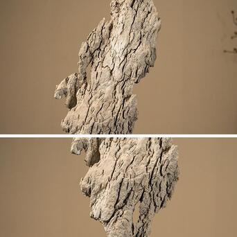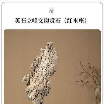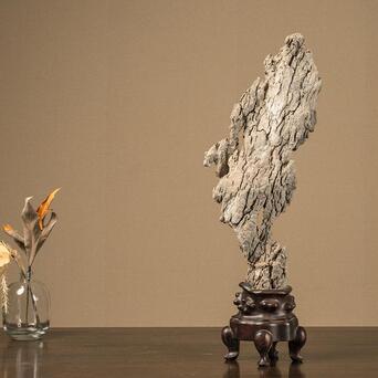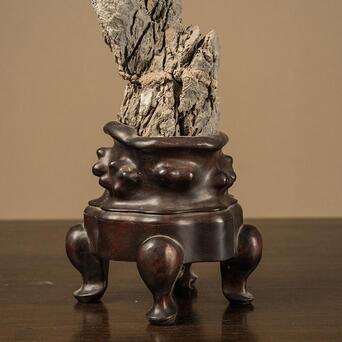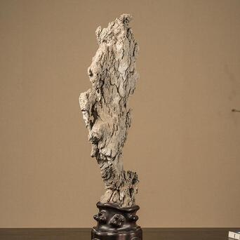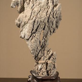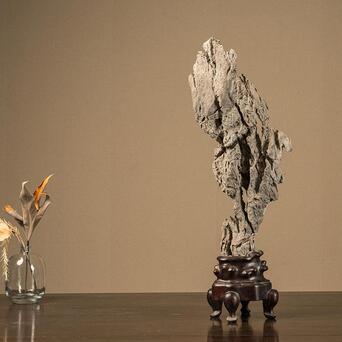 此品立峰,形状奇峻,底部收窄,中部向一侧突出,顶部又偏于内敛,窈窕婀娜,却因石表嶙峋而偏古朴沧桑。细细观之,可见表面沟壑纵横交错,褶皱繁密,天然排列深得自然精华。红木底座承托起整体氛围与气势,同时稳固地架起英石,置放平稳。